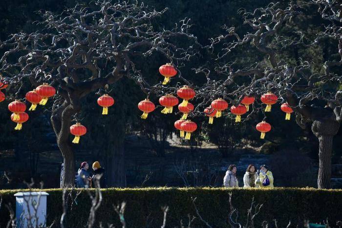 景山公园树上的红灯笼吸引游客的驻足观看。