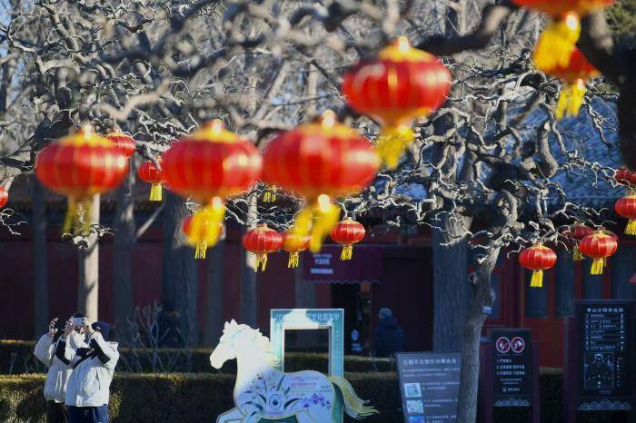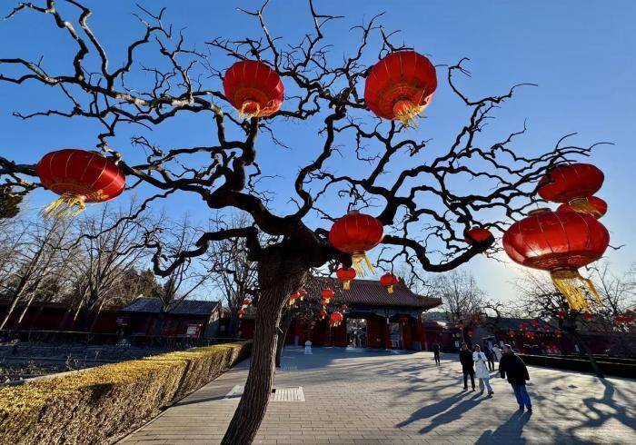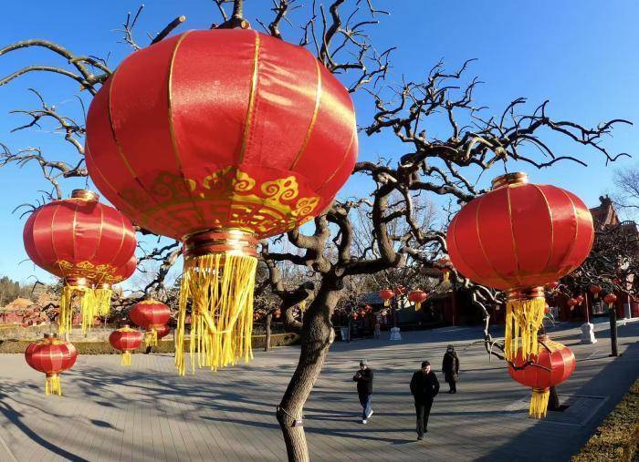 灯笼与园内苍劲的古柏形成鲜明的色彩对比,不仅营造出浓厚的传统年味儿,也为市民游客提供了绝佳的拍照打卡背景。