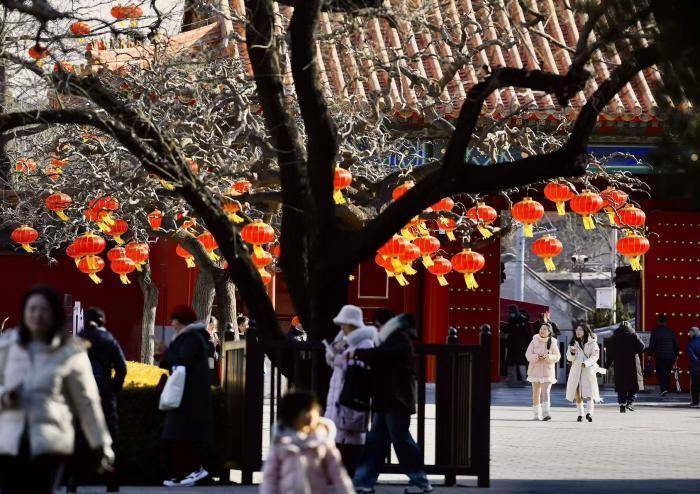 朱红光影与古建飞檐相映成趣,将皇家园林装点得红红火火。